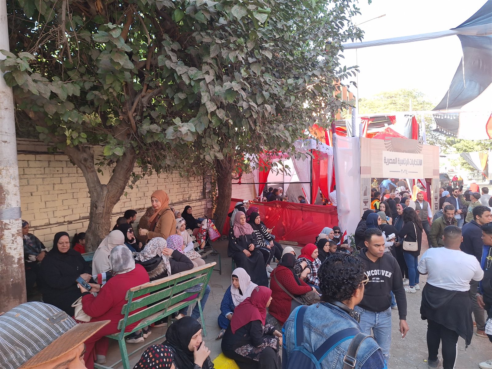جلست عشرات السيدات أمام الباب الرئيسي لمدرسة الشهيد محمد محمود عبد العزيز "أم الأبطال سابقًا"، في انتظار دورهن للدخول إلى اللجان للإدلاء بأصواتهن في ثاني أيام الانتخابات الرئاسية 2024.