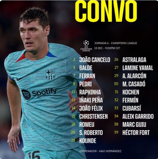 أعلن الجهاز الفني لفريق برشلونة الإسباني بقيادة تشافي هيرنانديز قائمة البلوجرانا لمباراة رويال أنتويرب البلجيكي، ضمن منافسات الجولة السادسة من دور مجموعات دوري أبطال أوروبا.