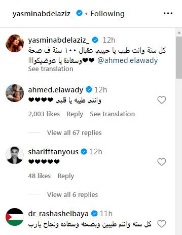 كتبت ياسمين عبدالعزيز عبر إنستجرام: "كل سنة وأنت طيب يا حبيبي عقبال ١٠٠ سنة في صحة وسعادة يا عوضيكوااا"، وظهرا في الصورة الأولى بإطلالة متناغمة، فارتدت ياسمين فستان أسود بسيط، تميز بتصميم A Line، وتكون محددة أعلى الخصر، وظهر العوضي ببدلة سوداء.