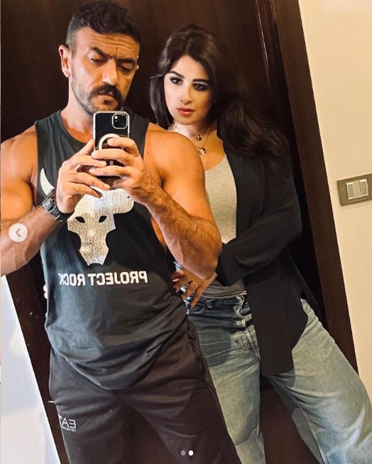 وفي الصورة الثانية، ظهرت ياسمين عبد العزيز خلف أحمد العوضي، مرتدية بنطال جينز فضفاض، وفوقه توب رمادي اللون وقميص أسود، كما ارتدى العوضي بنطلون وتيشيرت باللون الأسود.
