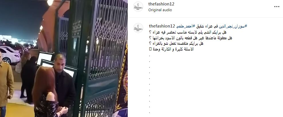 وعلقت شرطة الموضة على إطلالتها عبر موقع تبادل الصور والفيديوهات إنستجرام: "سوزان نجم الدين في عزاء شقيق أحمد حلمي.. هل برأيكم الشيء يلي لابسته مناسب تحضر فيه عزاء ؟.. هل معقولة ما عندها غير هل قطعة بالون الأسود بخزانتها ؟.. هل برأيكم متقصده تعمل شو بالعزاء؟.. الأسئلة كثيرة والكارثة واحدة".