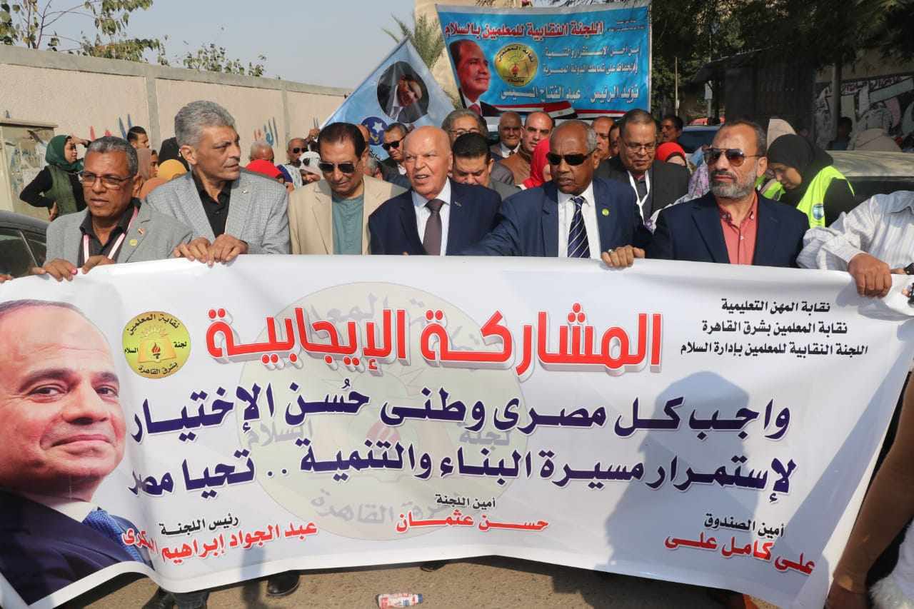 انطلقت مسيرة حاشدة للمعلمين، بمدينة السلام فى محافظة القاهرة، ضمت معلمين وأعضاء فرعيات ولجان نقابة المعلمين الفرعية بمحافظة القاهرة، حتى وصلت إلى اللجان الانتخابية للإدلاء بصوتهم فى الانتخابات الرئاسية 2024، بحضور خلف الزناتى نقيب المعلمين ورئيس اتحاد المعلمين العرب، ضمن جولاته الميدانية لحث المعلمين على المشاركة فى الاستحقاق الدستوري والتصويت فى الانتخابات الرئاسية 2024.