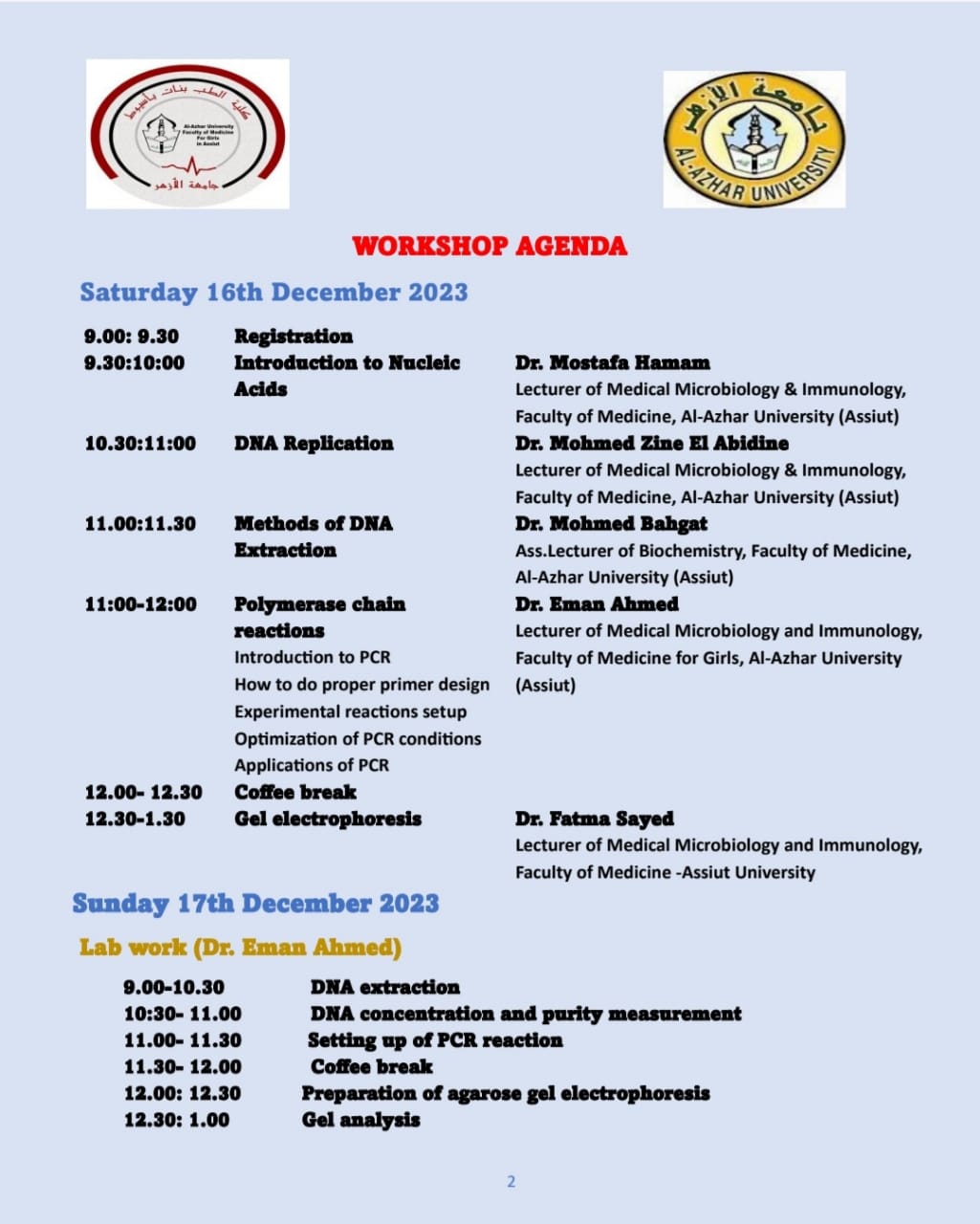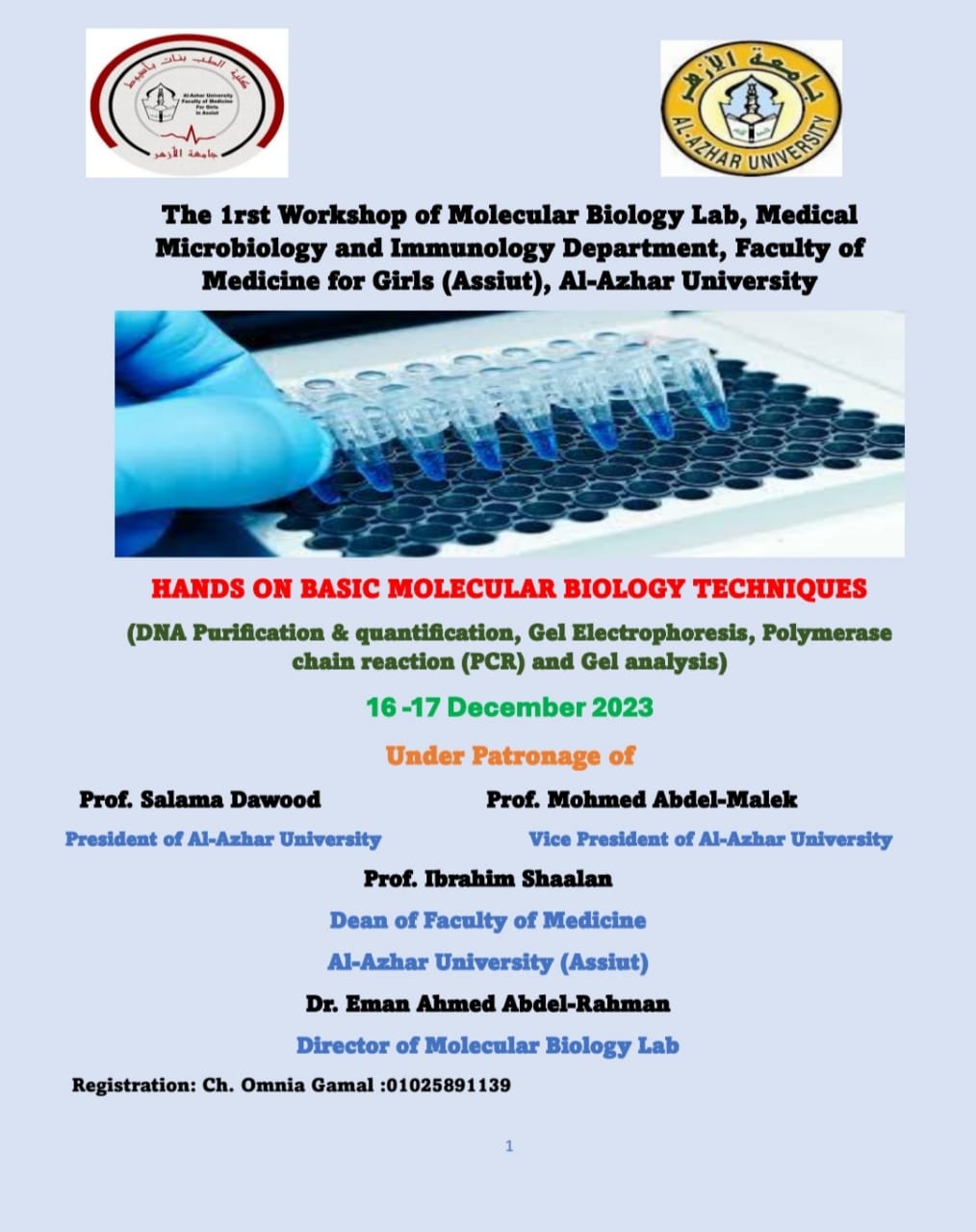 أعلن قسم ميكرو بيولوجي بكلية طب الأزهر بنات بأسيوط عن إقامة دورة تدريبية مجانية بعنوان "تقنيات البيولوجيا الجزيئية الأساسية" “Hands on Basic Molecular Biology Techniques” في معمل البيولوجيا الجزيئية، بإشراف الدكتورة إيمان أحمد عبدالرحمن، مديرة المعمل. تستهدف الدورة الطلاب والطالبات والباحثين في كليات الطب والصيدلة والعلوم والزراعة، وستقام يومي 16 و17 ديسمبر 2023 مجانًا برعاية الدكتور سلامة داود رئيس جامعة الأزهر والدكتور محمد عبدالمالك نائب رئيس الجامعة للوجه القبلي والدكتور إبراهيم شعلان عميد كلية الطب بنين والمشرف على كلية الطب بنات