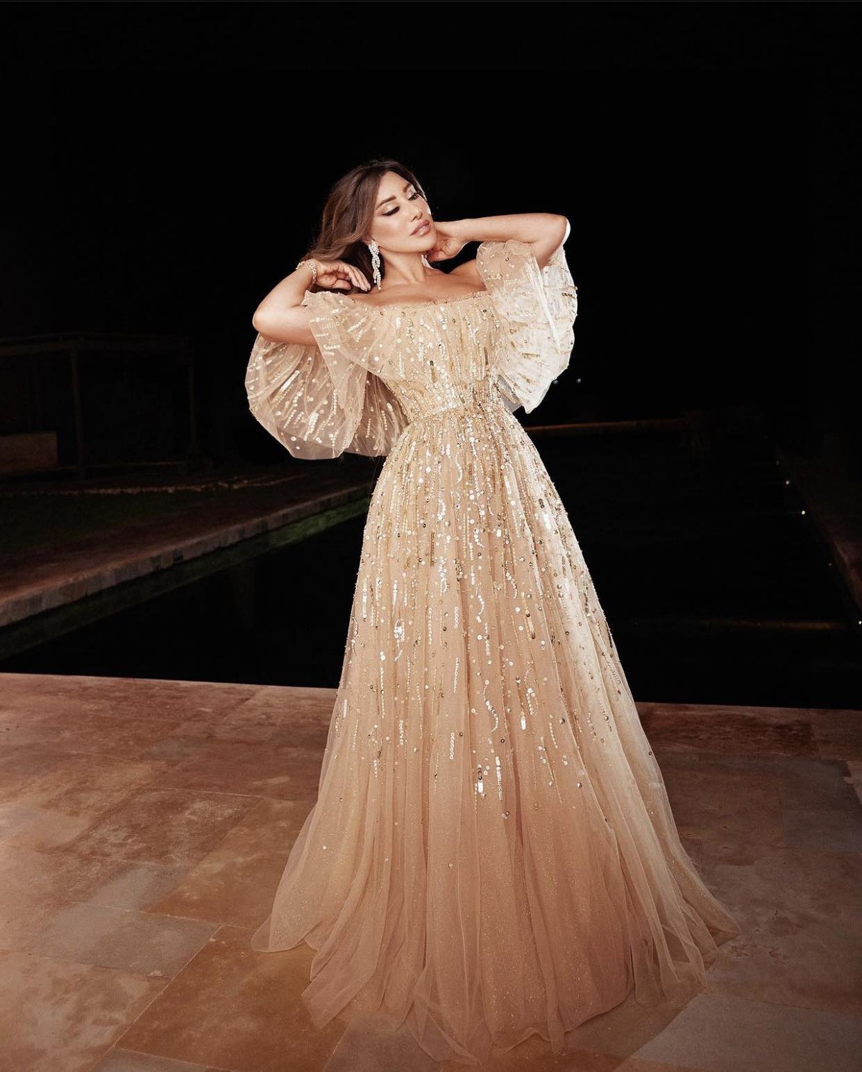 وبدت نجوى كرم بفستان منفوش باللون البيج، ومصنوع من قماش التُل متعدد الطبقات، ومُزين بالترتر اللامع، وتميز بقصة الأوف شولدر؛ لتبرز أنوثتها وجمالها.
