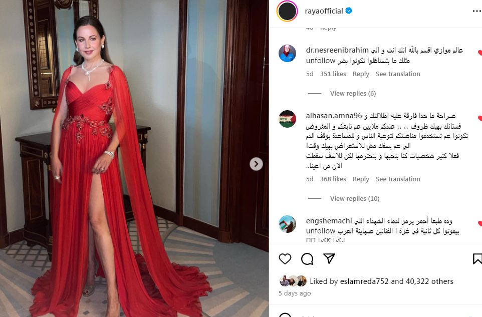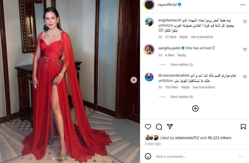 وتفاعل متابعيها مع إطلالتها وجاءت أبرز التعليقات معارضه لها: " وده طبعا أحمر يرمز لدماء الشهداء اللي بيموتوا كل ثانية في غزة ! الفنانين صهاينة العرب unfollow ليكوا كلكوا، عالم موازي اقسم بالله انك انت و الي مثلك ما بتستاهلوا تكونوا بشر unfollow، صراحة ما حدا فارقة عليه اطلالتك و فستانك بهيك ظروف، عندكم ملايين عم تابعكم و المفروض تكونوا عم تستخدموا مناصتكم لتوعية الناس و للمساعدة بوقف الدم الي عم يسفك مش للاستعراض بهيك وقت!، فعلا كتير شخصيات كنا بنحبها و بنحترمها لكن للاسف سقطت الآن من اعنينا".