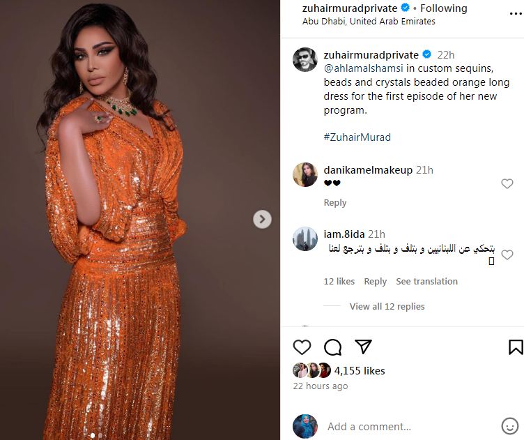 وتألقت أحلام الشامسي بإطلالة زاهية حيث ارتدت فستانا طويلا، وأكمام واسعه، بتصميم مميز، وحمل توقيع مصمم أزياء اللبناني زهير مراد، من مجموعة كوتور ربيع 2023.