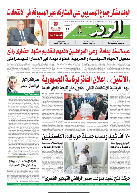 تنشر جريدة الوفد اليومية الورقية في عددها الصادر، غدًا الخميس، الكثير من الموضوعات والتقارير الإخبارية المهمة، أبرزها: "الوفد يشكر جموع المصريين على المشاركة غير المسبوقة في الانتخابات".