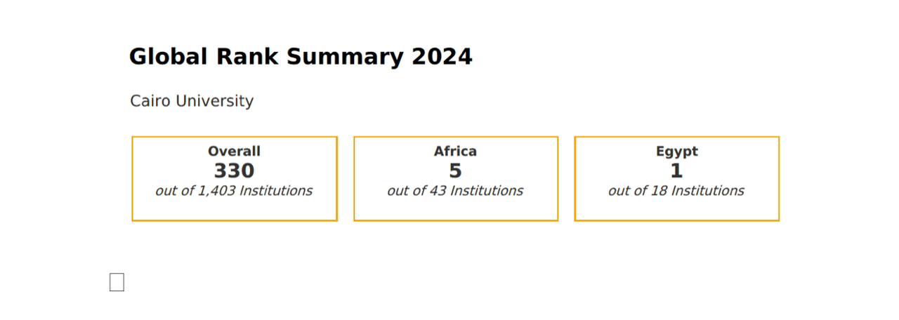 جدير الذكر أن جامعة القاهرة في صدارة الجامعات المصرية 330 عالميًا يليها جامعة المنصورة في المرتبة 364 عالميًا ثم الجامعة الامريكية بالقاهرة 609 عالميًا وجامعة عين شمس 695 عالميًا وقناة السويس من 721-730 وجامعتي الإسكندرية وبنها 761-770 وجامعة بنها وجامعتي أسيوط والزقازيق 821-840 عالميًا.