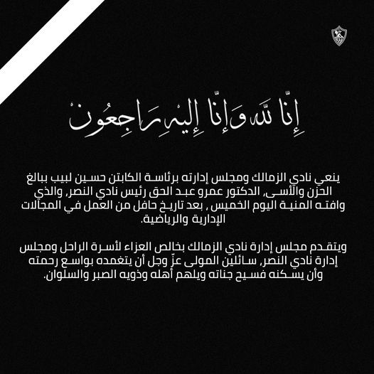 ينعي نادي الزمالك ومجلس إدارته برئاسة الكابتن حسين لبيب ببالغ الحزن والأسى، الدكتور عمرو عبد الحق رئيس نادي النصر، والذي وافته المنية اليوم الخميس، بعد تاريخ حافل من العمل في المجالات الإدارية والرياضية.