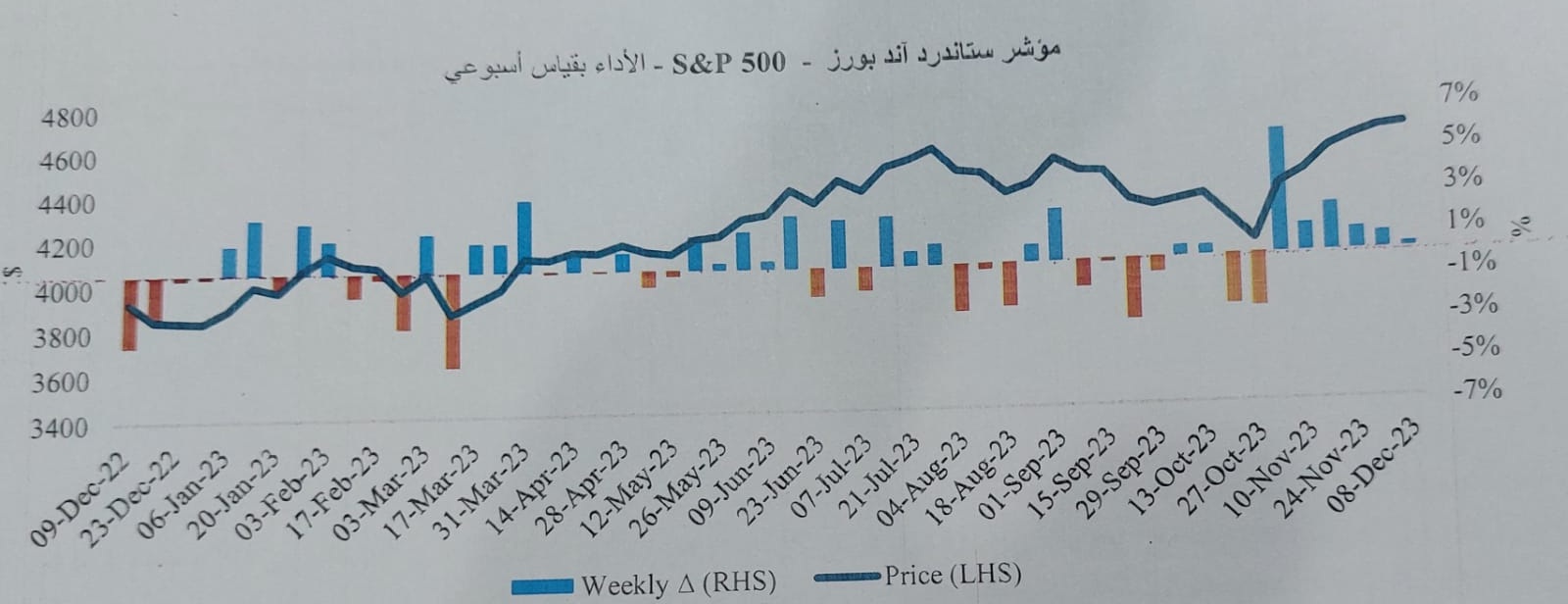 ومن أبرز الملامح الاقتصادية للأسواق العالمية خلال الأسبوع الأول من ديسمبر الحالي، ارتفاع عوائد سندات الخزانة قصيرة الأجل بشكل كبير رغم التباطؤ الملحوظ في سوق العمل، وباستثناء السندات طويلة الأجل، ارتفعت العوائد على جميع الاستحقاقات مما جعل المستثمرين إلى مراجعة توقعاتهم بشأن السياسة النقدية للاتحاد الفيدرالي الأمريكي للعام القادم مع الإشارة إلى تباطؤ سوق العمل وأظهرت المؤشرات أن سوق العمل لا يزال يتسارع بشكل أكبر من المستوى الذي يفضله بنك الاحتياطي الفيدرالي وكان من نتيجة ذلك، ارتفاع عوائد كل من سندات الخزانة والدولار في الوقت الذي انخفض فيه الذهب بنسبة 3.26 % ليصل سعر الأونصة إلى 2.004 دولار "الأونصة 31.1 جرام" إلا أنها لاتزال أعلى من المستوى الرئيسى البالغ 2000 دولار، وكان الذهب قد وصل إلى أعلى مستوى له مع أواخر نوفمبر الماضى.