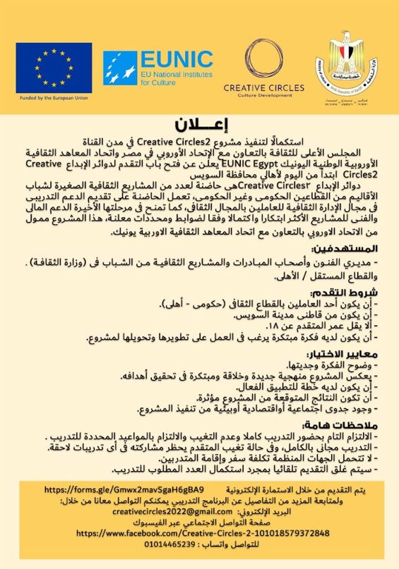أعلن المجلس الأعلى للثقافة بأمانة الدكتور هشام عزمي بالشراكة مع اتحاد المعاهد الثقافية الأوروبية اليونيك EUNIC Egypt عن فتح باب التقديم فى مرحلة جديدة من مبادرة دوائر الإبداع Creative Circles، والتى تستهدف هذا العام بناء قدرات المدير الثقافى بمحافظة المنيا بدءا من يوم 15 ديمسبر 2023.