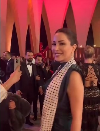 أما عن الفنانة نسرين طافش، فقد ظهرت بفستان أسود اللون، واختارت أن ترتدي معه الكوفية لتعبر عن تضامنها مع شعب غزة.