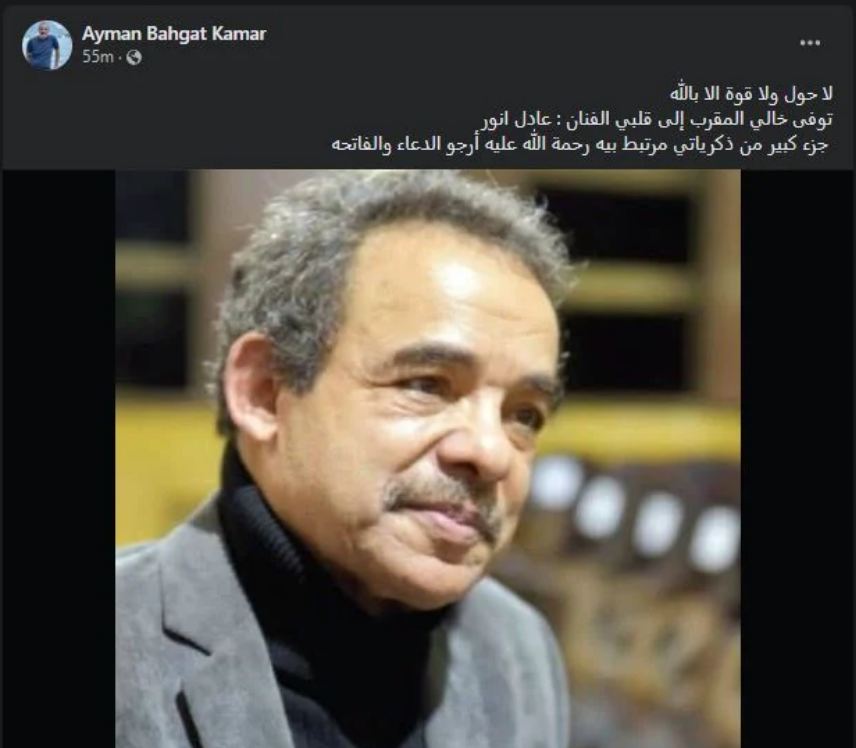 كتب الشاعر أيمن بهجت قمر، عبر صفحته قائلًا : "لا حول ولا قوة الا بالله.. توفى خالي المقرب إلى قلبي الفنان عادل أنور.. جزء كبير من ذكرياتي مرتبط بيه رحمة الله عليه أرجو الدعاء والفاتحة.
