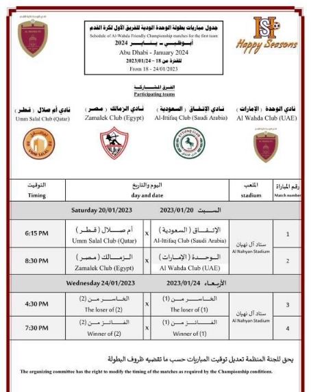 تقام مباراة الزمالك والوحدة الإماراتي ضمن منافسات البطولة الودية التي تستضيفها أبوظبي يوم 20 يناير المقبل في الساعة الثامنة والنصف ويسبقها مباراة نصف النهائي الأخرى بين أم صلال والإتفاق.