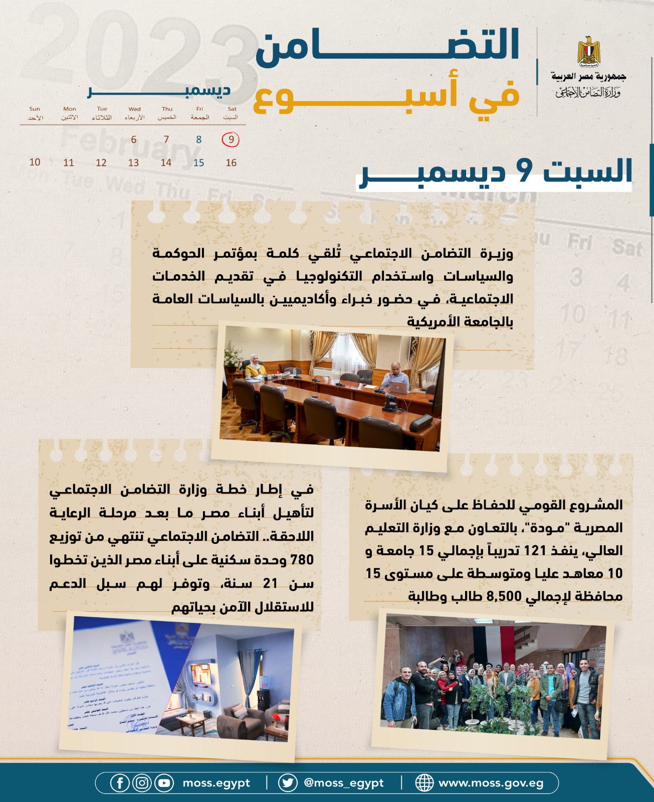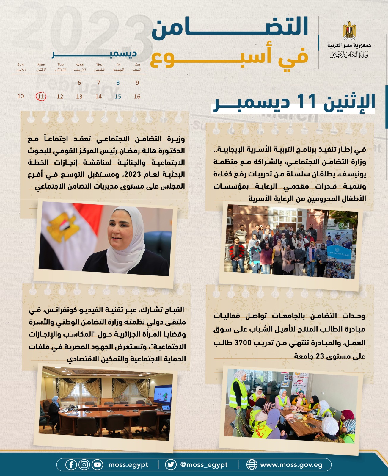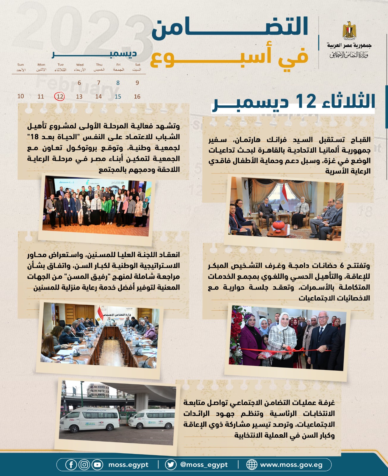 أصدرت وزارة التضامن الاجتماعي تقريرها الأسبوعي بالإنفوجراف والفيديو، حيث تستعرض من خلاله الأنشطة والأحداث، التي قامت بها السيدة نيفين القباج، وزيرة التضامن الاجتماعي، وكذلك قطاعات الوزارة المختلفة، خلال الفترة من 8 ديسمبر  إلى 14 ديسمبر 2023، ونستعرض أبرزها في التقرير التالي: