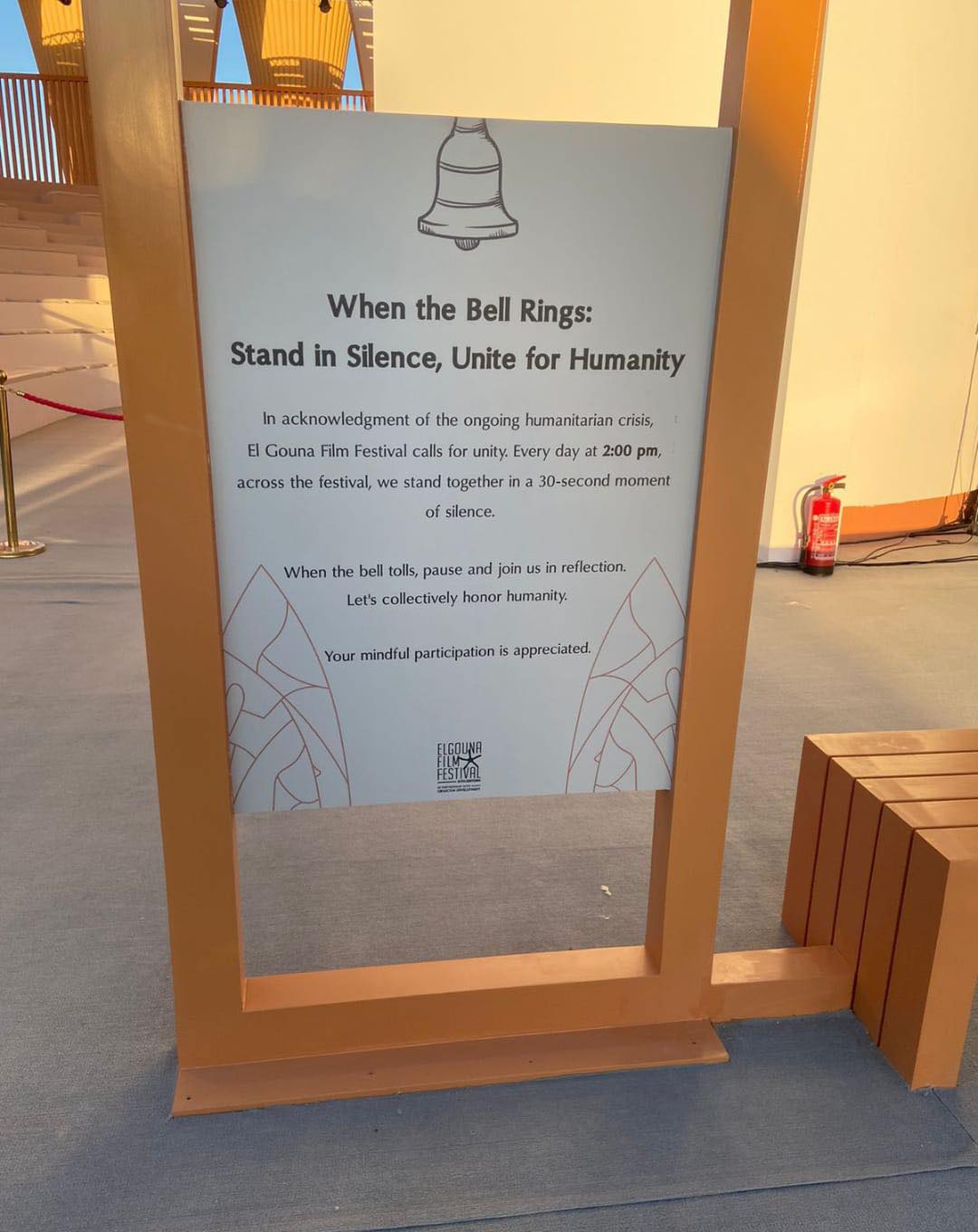 "في الثانية ظهرا حينما تستمع إلى دقات الجرس، دع ما في يديك وانضم إلينا لنقف 30 ثانية صامته"، دعوة يقدمها مهرجان الجونة السينمائي في دورته السادسة.