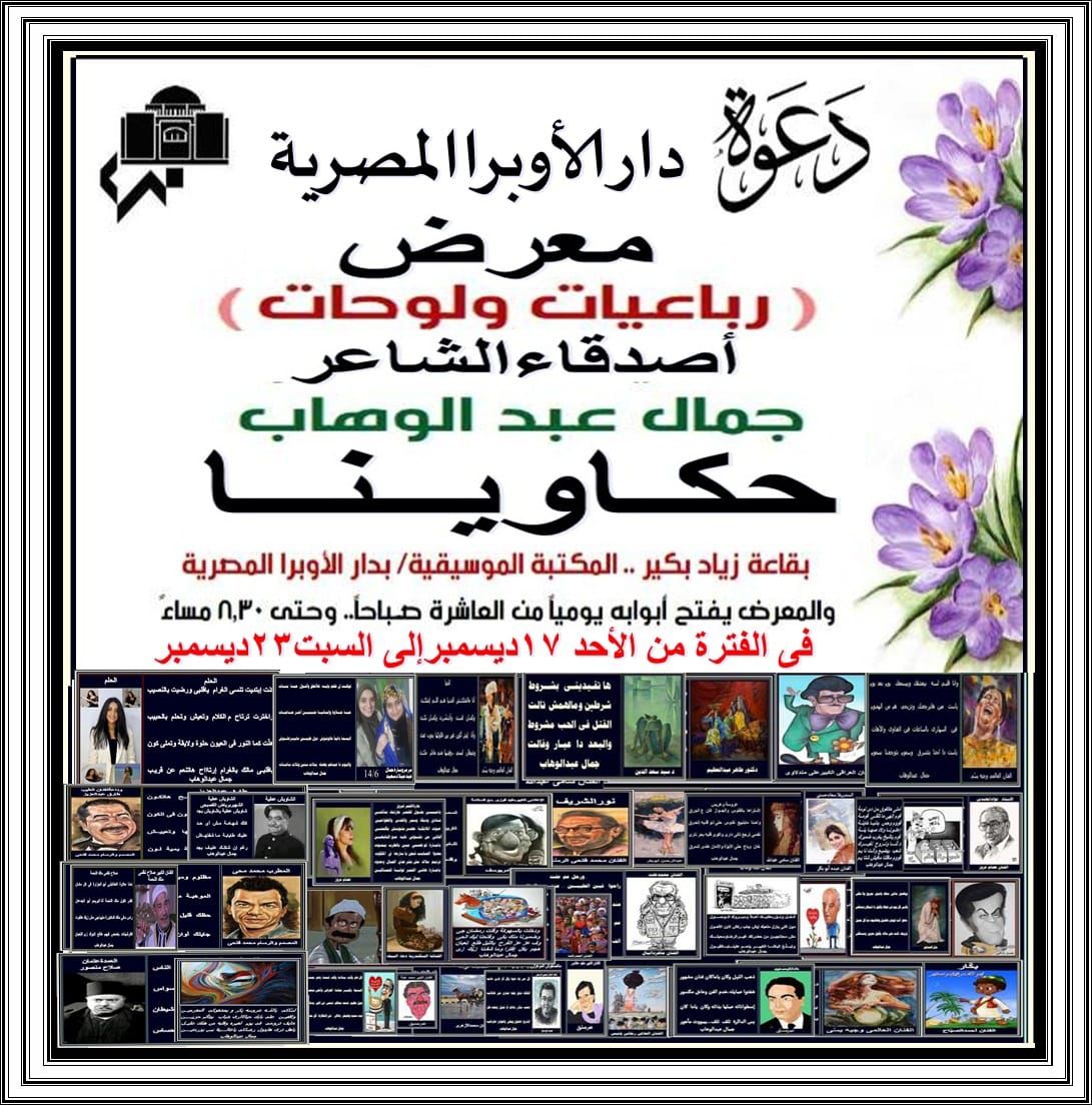 تستضيف قاعة زياد بكير بدار الاوبرا معرض للفنان الشاعر جمال عبد الوهاب تحت عنوان "حكاوينا" وذلك في السادسة والنصف مساء الاحد ١٧ ديسمبر ويستمر حتي السبت ٢٣ ديسمبر .