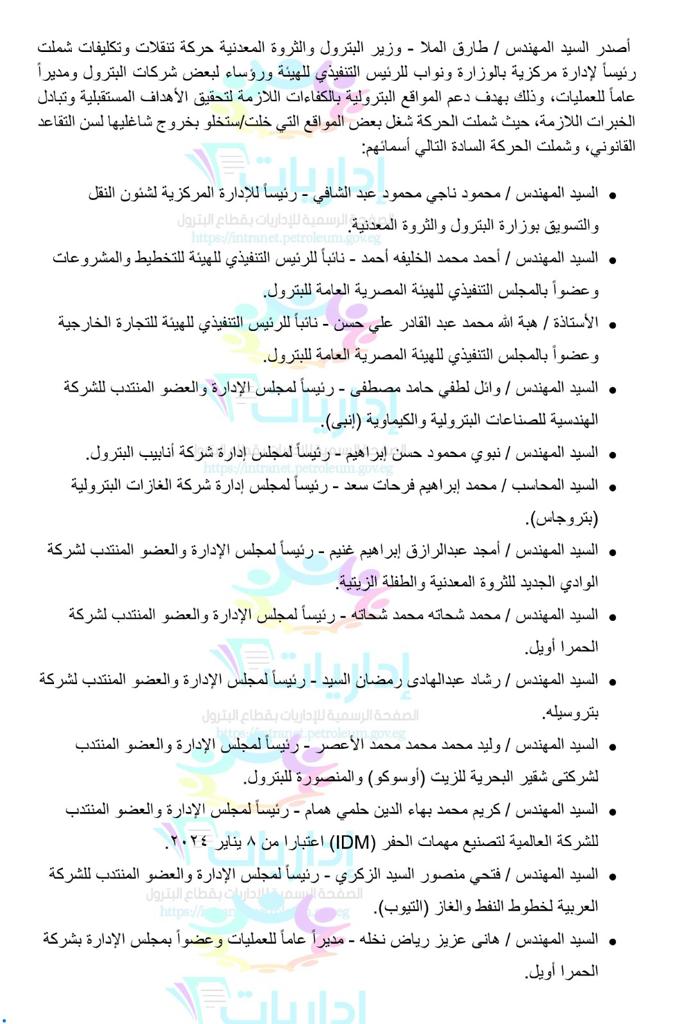 أصدر المهندس طارق الملا وزير البترول والثروة المعدنية ، حركة تكليفات وتنقلات