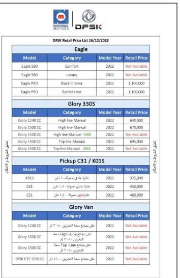 أعلنت شركة ناشيونال موتورز، وكيل علامة DFSK في مصر، شبكة موزعيها المعتمدين عن أحدث قائمة سعرية لسيارات العلامة الصينية، والتي يتم العمل بداية من اليوم 18 ديسمبر، وشملت القائمة السعرية الجديدة الصادرة عن شركة ناشيونال موتورز، أسعار طرازات DFSK المتوافرة في السوق المحلية: "إيجل برو، وجلوري 330S، وعدد من أسطول النقل الخفيف التابع للعلامة".