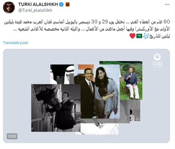 أما السعودية فسيتم ختام 2023 بشكلٍ مختلف، حيث يقام حفل أسطوري تكريمي لفنان العرب محمد عبده، الذي يقام على مدار ليلتين بمناسبة مرور 60 عامًا على مسيرته الفنية.