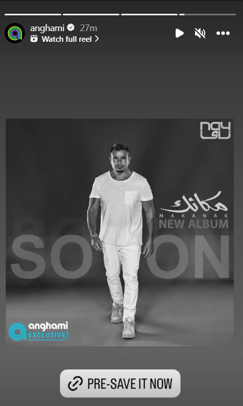 وبالفعل انطلقت مرحلة ماقبل البيع على “أنغامي” منذ دقائق تمهيدًا لاقتراب طرح “مكانك”، الحدث الذي ينتظره جمهور عمرو دياب منذ بدء الإعلان عن الالبوم خلال الأسبوع الماضي.