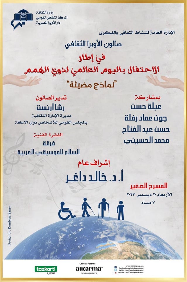 يعقد صالون الأوبرا الثقافى لقاء بعنوان "نماذج مضيئة" ضمن فعاليات النشاط الفكرى والثقافى لدار الأوبرا المصرية برئاسة الدكتور خالد داغر وبمناسبة اليوم العالمى لذوى الهمم.
