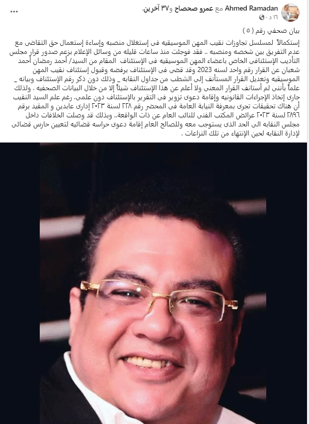 بيان محامي المايسترو أحمد رمضان ردًا على شطبه من نقابة الموسيقيين