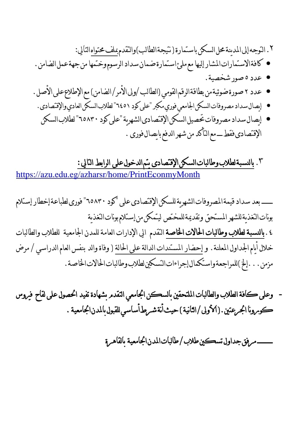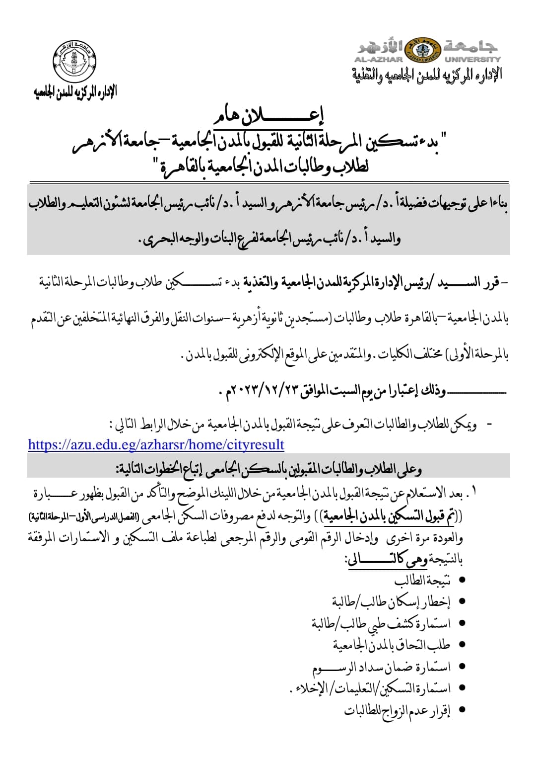 رسميًا.. موعد تسكين طلاب المرحلة الثانية للقبول بالمدن الجامعية بالأزهر وطريقة الاستعلام