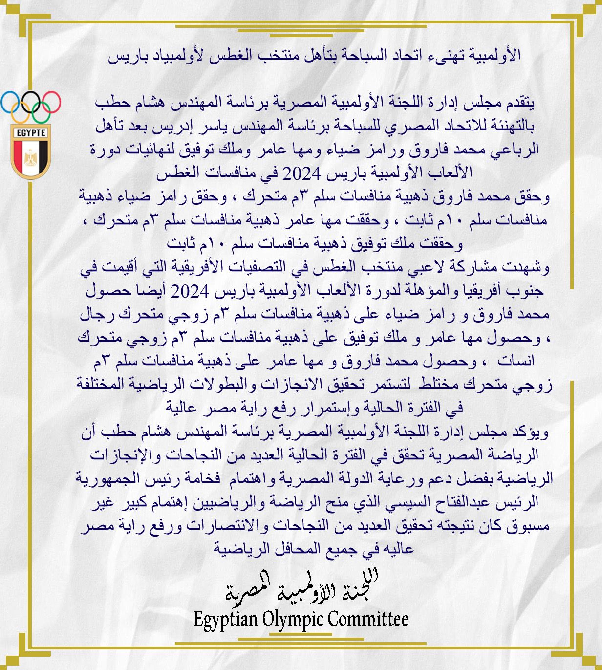 قدم مجلس إدارة اللجنة الأولمبية المصرية برئاسة المهندس هشام حطب التهنئة للاتحاد المصري للسباحة برئاسة المهندس ياسر إدريس بعد تأهل الرباعي محمد فاروق ورامز ضياء ومها عامر وملك توفيق لنهائيات دورة الألعاب الأولمبية باريس 2024 في منافسات الغطس