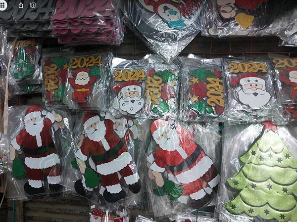 وأكمل أنه يوجد أدوات زينة الكريسماس عديدة أبرزها مجسمات بابا نويل، والدوائر الملونة وعلب الهدايا والغزال الذهبي والكور الذهبية المصممة من اصياغ الحديد، فضلا عن أشجار الكريسماس "القمع" أو الأنفد التي تتصدر المشهد هذا العام.