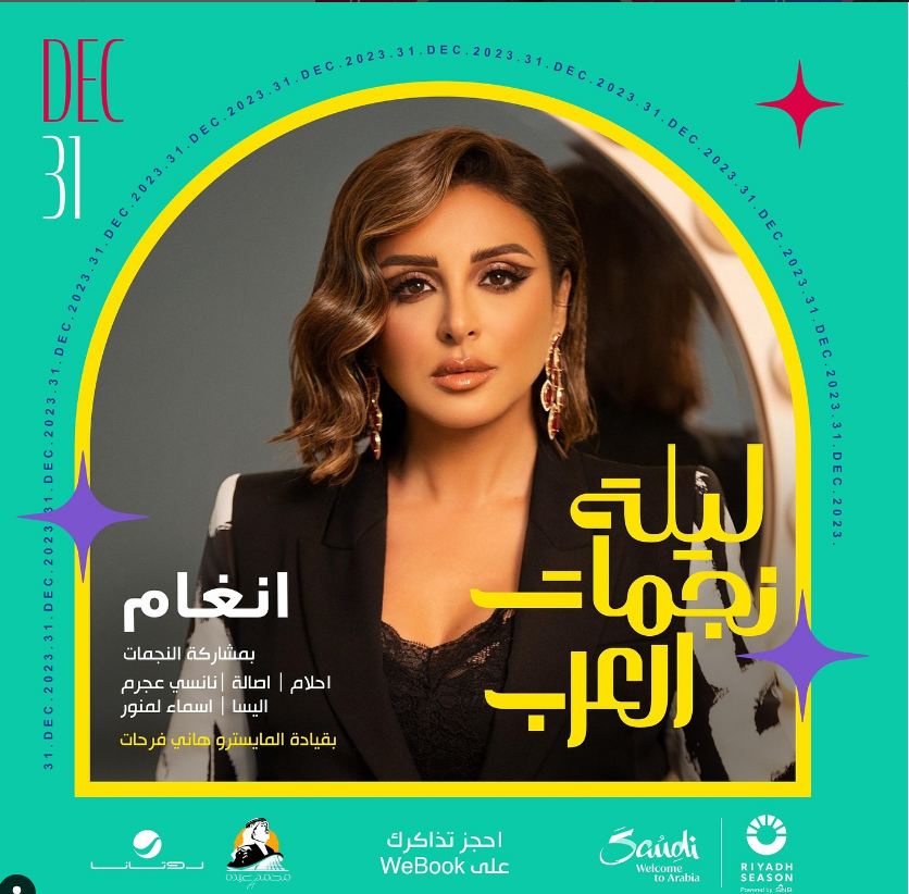 تختتم أنغام برنامج حفلاتها الغنائية لعام 2023 بحفل غنائي بـ"ليلة نجمات العرب"، الذي يقام ضمن فعاليات موسم الرياض، والتي تضم عدد كبير من نجوم الطرب العربي النسائي.