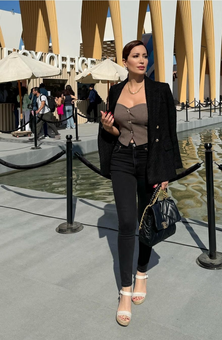 وبدت نسرين طافش بإطلالة عصرية تتميز بالأنوثة والأناقة في آن واحد، حيث ارتدت توب ضيق، وعليه جاكيت طويل صمم من قماش ناعم باللون الأسود، زين بالازرار الذهبية،  ونسقت عليه بنطال جينز بنفس اللون، عكس قوامها الممشوق ووزنها المثالي، فيما انتعلت صندلا بكعب عال .
