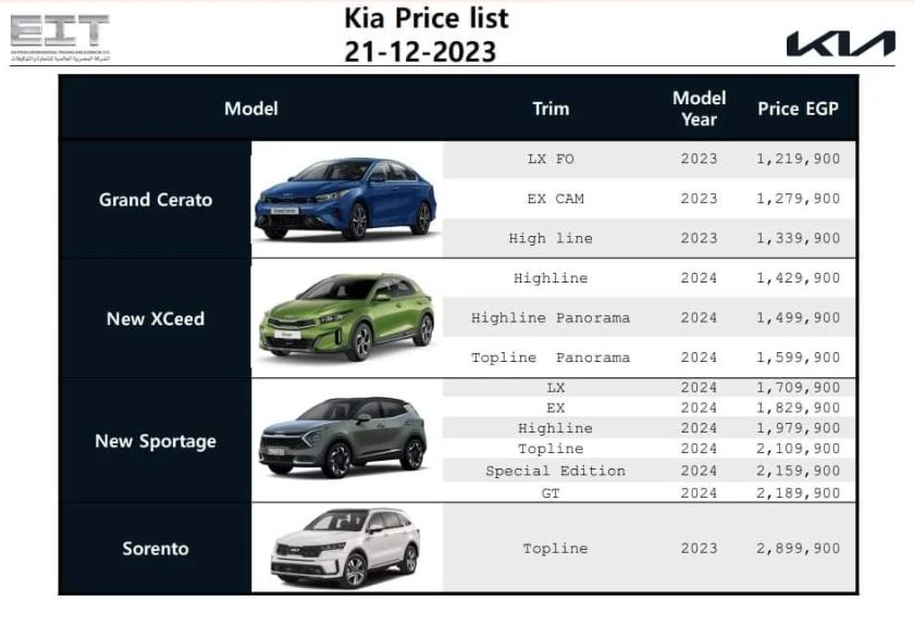 أعلنت الشركة العالمية للتجارة والتوكيلات EIT، وكيل علامة كيا في مصر، رسمياً عن أحدث قائمة سعرية لسيارات العلامة الكورية الجنوبية المتوافرة في السوق المحلية، وشهدت القائمة الصادرة عن الشركة العالمية للتجارة والتوكيلات EIT، والتي حصلت بوابة الوفد الإلكترونية على نسخة منها، ارتفاعاً في أسعار سيارات كيا.
