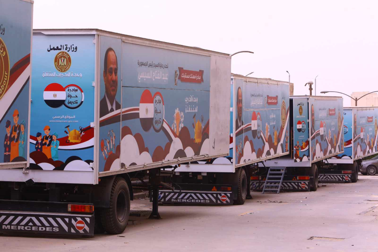نشرت وزارة العمل، اليوم الأحد، على مواقعها الرسمية على الإنترنت، صورًا، بشأن 10 عربات تدريب مُتنقلة جديدة جاهزة للانطلاق إلى عددٍ من المحافظات، لتقوم بمهام تدريب وتأهيل الشباب على مهن يحتاجها سوق العمل، وذلك في نطاق المبادرة الرئاسية "حياة كريمة"، ومبادرة "مهنتك مُستقبلك".