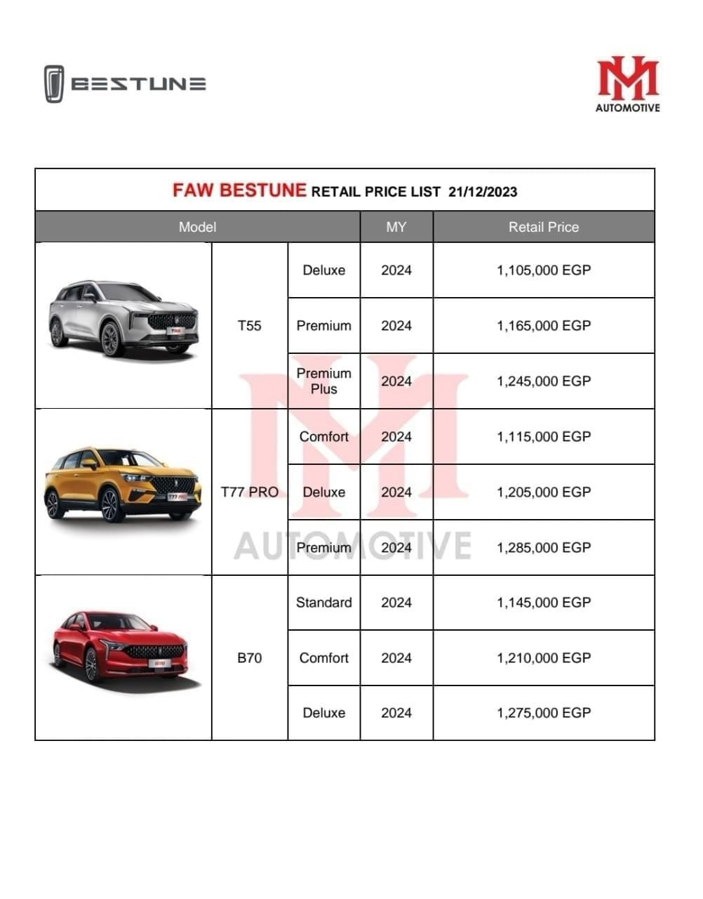 وتقدم بوابة الوفد الإلكترونية لمتابعيها القائمة السعرية الجديدة لسيارات فاو بيستيون "b70، وt77، وt55" موديل 2024.
