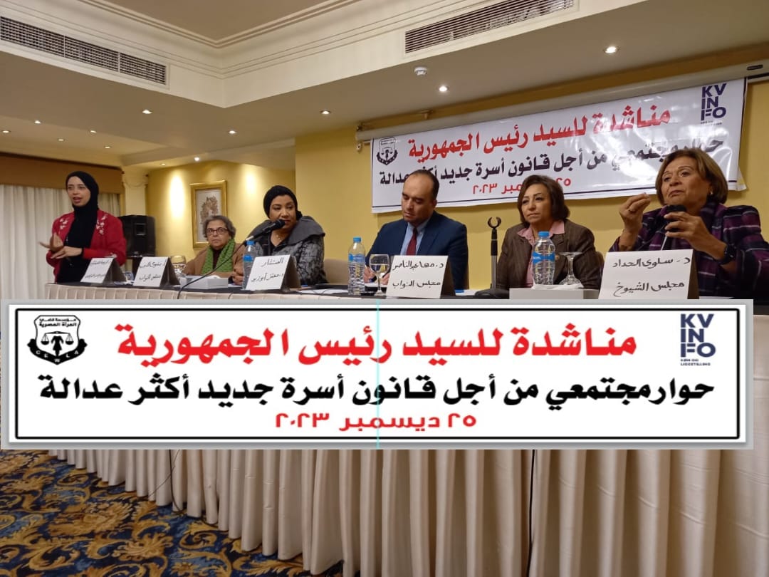 أقامت مؤسسة قضايا المرأة المصرية اليوم الإثنين الموافق ٢٥ ديسمبر الجاري، مائدة حوار لمناشدة رئيس الجمهورية بضرورة طرح قانون الأحوال الشخصية الجديد للحوار المجتمعي، وتأتي مائدة الحوار في إطار الشراكة بين المؤسسة ومؤسسة "كفينفو" و برنامج الشراكة الدنماركية العربية في إطار مشروع " نحو قانون أسرة أكثر عدالة لكل أفراد الأسرة “، والذي يهدف الى دعم وصول النساء إلى العدالة من خلال قوانين أسرة عادلة ومنصفة، وبناء جبهة قادرة على الترويج ودعم قوانين الأحوال الشخصية المقترحة.