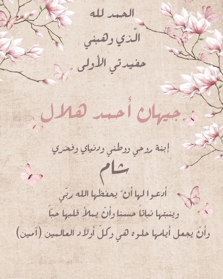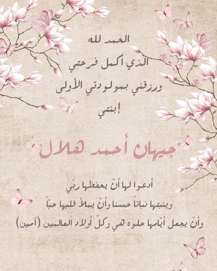 شاركت الفنانة “أصالة” الخبر مع المتابعين عبر حسابها بموقع إنستجرام بنشر نفس الصورة وعلقت قائلة: "الحمدالله الذي وَهبني حفيدتي الأولى (جيهان أحمد هلال)، ابنة روحي ووطني ودُنياي وفخري، أدعوا لها أن يحفظها الله ربّي، ويُنبتها نباتًا حسنًا، وأن يملأ قلبها حبًّا، وأن يجعل أيامها حلوة هي وكلّ أولاد العالمين".