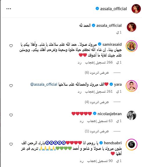 تلقت الفنانة أصالة المباركات والتهانى من النجوم والمشاهير ومنهم هدى حسين، يارا، هند صبرى، سميرة سعيد، هدى حسين، أسماء لمنور وغيرهم.