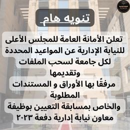 تبدأ اليوم الثلاثاء النيابة الإدارية إجراءات سحب وتقديم ملفات المتقدمين لشغل وظيفة معاون نيابة إدارية، من خريجي كلية الحقوق بجامعات (طنطا والمنصورة ودمياط والإسكندرية والفيوم وأزهر أسيوط وبني سويف والمنيا وأزهر المنيا وأسوان) من دفعة 2023 ممن أتموا عملية التسجيل الإلكتروني، وفقًا للضوابط والمواعيد المحددة لكل جامعة والتي سبق وأعلنتها الأمانة العامة للمجلس الأعلى للنيابة الإدارية.