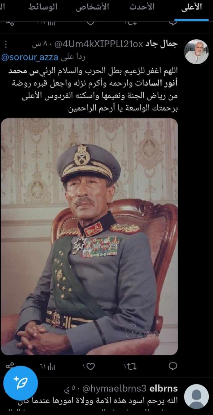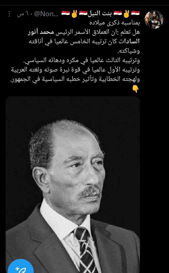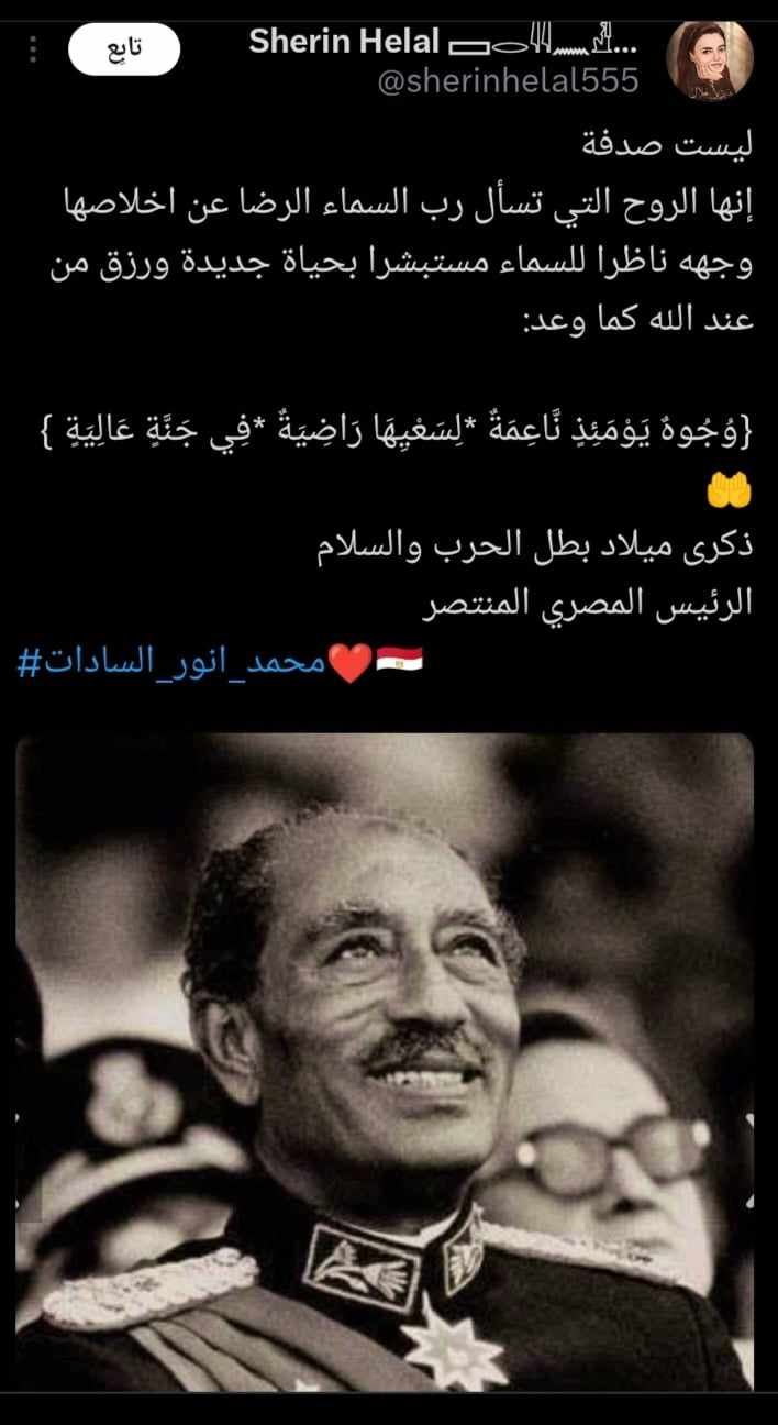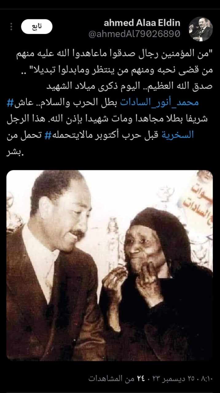كتب أحد رواد منصة " X ": ( من المؤمنين رجال صدقوا ما عاهدوا الله عليه فمنهم من قضى نحبه ومن من ينتظر وما بدلوا تبديلا) صدق الله العظيم ، اليوم ذكرى ميلاد الشهيد محمد أنور السادات بطل الحرب والسلام عاش شريفا بطلا مجاهدا وما تشهيدا بإذن الله ، هذا الرجل تحمل قبل حرب اكتوبر ما لا يتحمله بشر.