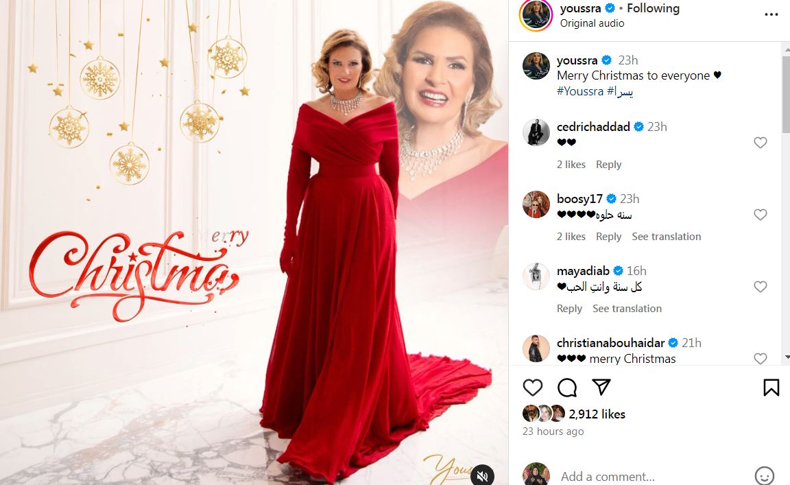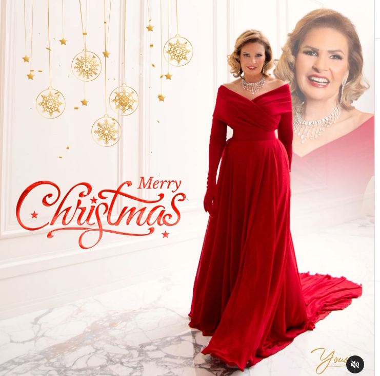وبدت يسرا بإطلالة أنيقة متناغمة مع الأحتفال بعيد الميلاد المجيد، حيث ارتدت فستانا طويلا مجسما من أعلى وفضفاضا من أسفل، ينتمي لقصة الأوف شولدر، مزود بجوانتي، الفستان محدد الخصر، صمم من قماش المخمل الناعم باللون الأحمر الصارخ.