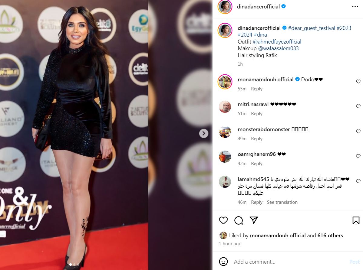 وظهرت دينا في أحدث ظهور لها خلال حضورها حفل توزيع الجوائز لمهرجان الدير جيست، بإطلالة سوداء تميل للجرأة، حيث ارتدت فستانا مجسما قصيرا، بأكمام طويلة، صمم من المخمل الناعم باللون الأسود مزين بحبات الخزر من الجانب، حمل توقيع مصمم الأزياء أحمد فايز، مما عكس قوامها الممشوق ووزنها المثالي، فيما انتعلت حذاء بكعب عال بنفس لون الفستان.