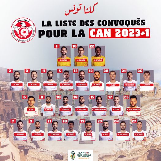 وجاءت قائمة منتخب تونس النهائية لكأس أمم أفريقيا كالآتي: