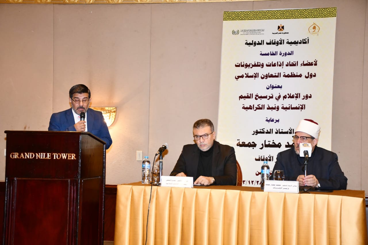 وخلال حفل التكريم هنأ وزير الأوقاف المشاركين في دورة أكاديمية الأوقاف الدولية من أعضاء اتحاد إذاعات وتلفزيونات دول منظمة التعاون الإسلامي بانتهاء هذه الدورة المتميزة، التي عُقدت بالتزامن مع انعقاد المسابقة الدولية الثلاثين للقرآن الكريم، مؤكدًا على عمق التواصل والتعاون بين وزارة الأوقاف واتحاد إذاعات وتلفزيونات دول منظمة التعاون الإسلامي، والذي يأتي في إطاره هذه الدورة الخامسة، موجهًا رسالة إلى الأئمة بأن أمامهم قدوة وأنموذجًا فريدًا، فهؤلاء النخبة من القيادات الإعلامية وكبار الإعلاميين لا يزالون يبحثون عن مزيد من التأصيل العلمي والثقافي، ولم يستنكفوا أبدًا عن الرحلة وتحمل المشاق في طلب المزيد من الاطلاع على التجارب، ولو لم يكن في هذه الأسفار إلا التلاقي بين الزملاء من مختلف دول العالم الإسلامي، والاطلاع فيما بينهم على تجاربهم الإعلامية والثقافية لكان ذلك كافيًا، وقد قال أحد العقلاء تعلمت من زملائي ما لم أتعلم من أساتذتي، وتعلمت من طلابي ما لم أتعلم من زملائي، وخاصة أننا في عالم سريع التطور وبالأخص في مجال الإعلام، مؤكدًا أنه حيث تتوقف عن التعلم سواء أكان تعلمًا نظاميًّا أو تعلمًا ذاتيًّا يسبقك الزمن ويسبقك الآخرون، والعلم شاطئ لا نهاية له، وقد قال قائل: أعط العلم كلًا يأتيك العلم بعضًا، فإن أعطيت العلم بعضًا لن يعطك العلم شيئًا.