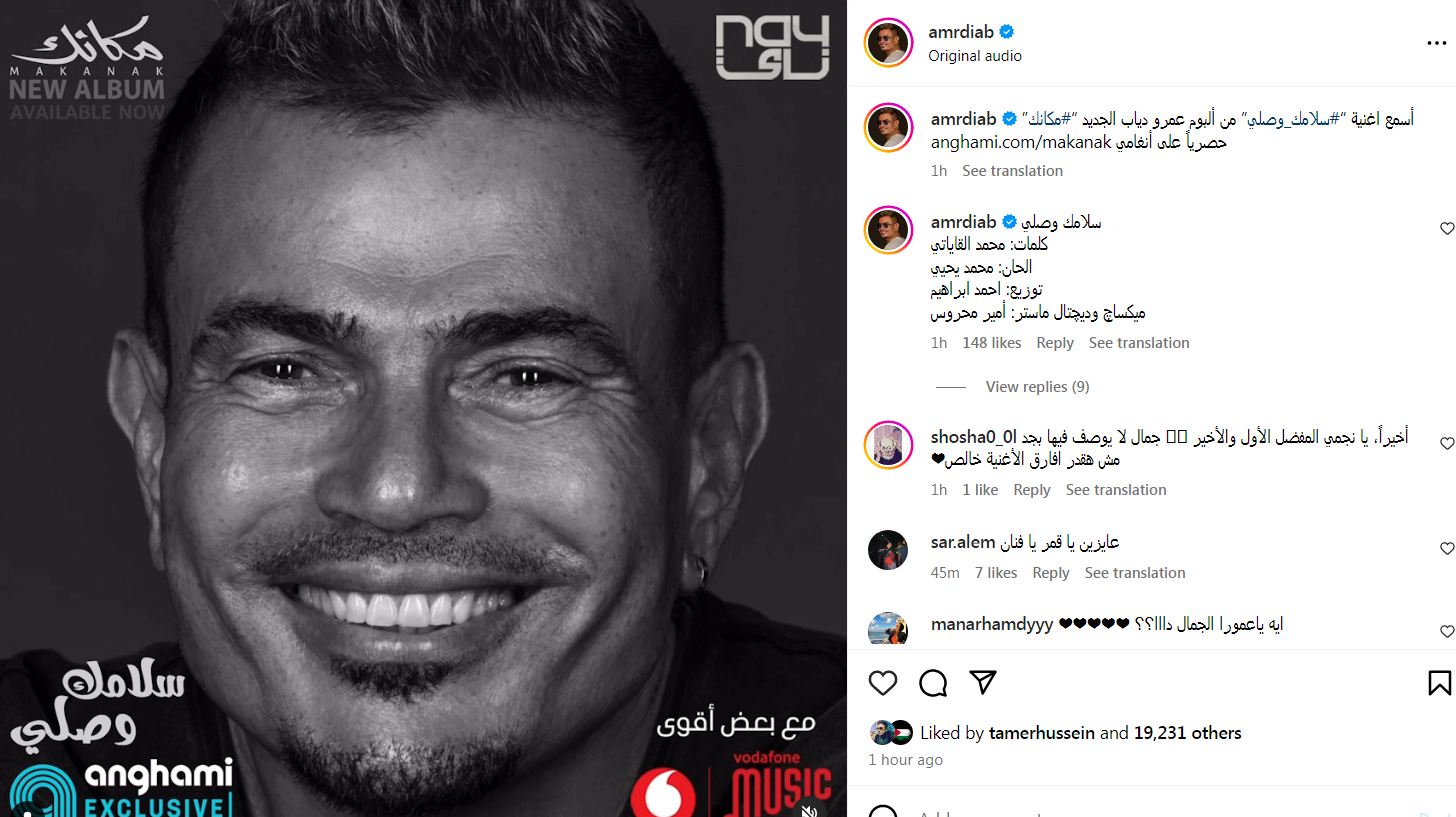طرح الهضبة عمرو دياب الأغنية الثانية من ألبوم مكانك بعنوان “سلامك وصلّي” حصريًا عبر المنصة الموسيقية الشهيرة “أنغامي”.