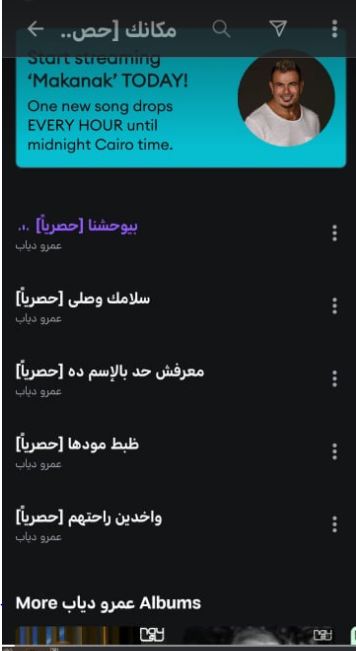 طرح عمرو دياب من “مكانك” 5 أغان حتى الآن وهم “بيوحشنا، سلامك وصلي، معرفش حد بالاسم ده، ضبط مودها، واخدين راحتهم”.