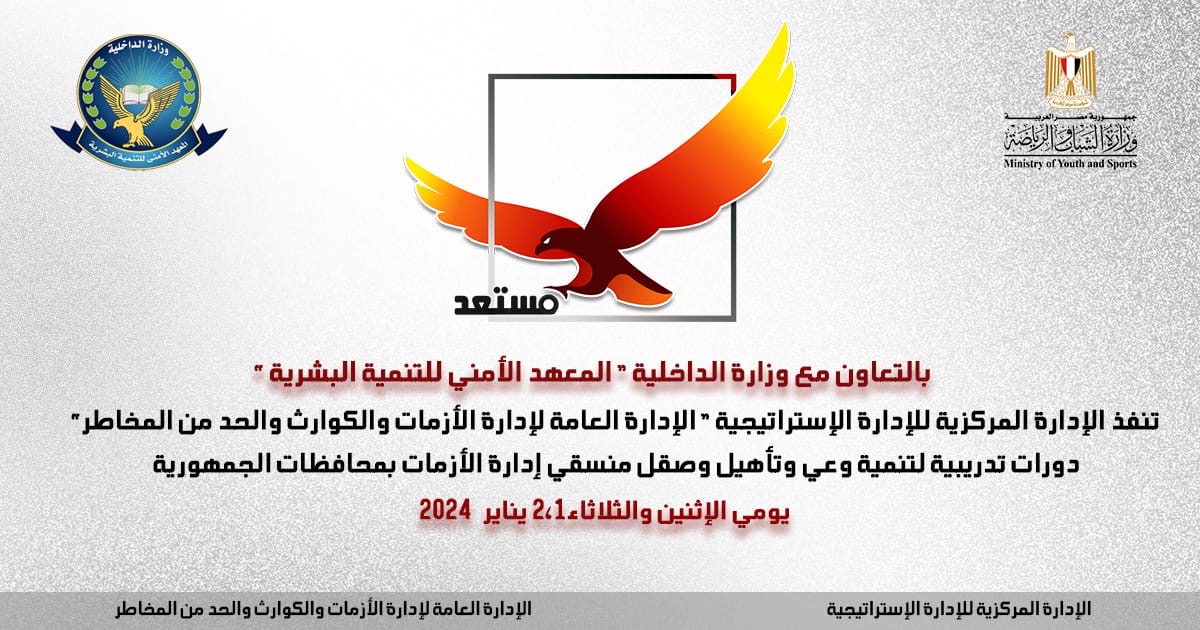 تنظم الإدارة المركزية للإدارة الاستراتيجية - الادارة العامة لإدارة الأزمات والكوارث والحد من  المخاطر، دورات تدريبية وورش عمل لتوعية مسئولي إدارة الأزمات بمديريات الشباب والرياضة بالمحافظات، وذلك خلال الفترة من 1 وحتى 2 يناير المقبل، بالتعاون مع المعهد الأمني للتنمية البشرية بوزارة الداخلية.