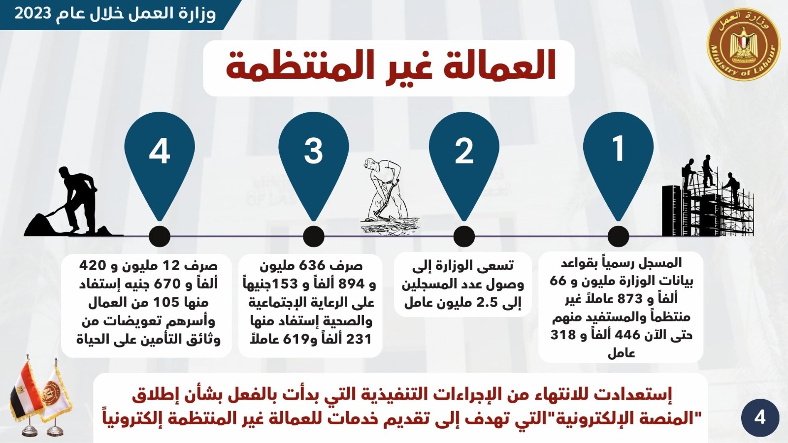 شهد ملف العمالة غير المنتظمة، اهتمامًا فائقًا من وزارة العمل خلال العام الأخير 2023، إذ إنه يعد أحد أهم الملفات التي أولتها الوزارة اهتمامًا غير مسبوق، وجاءت توجيهات الرئيس عبد الفتاح السيسي مباشرة وصريحة في تقديم كل الدعم لهذه الفئة خاصة مع ظهور تداعيات فيروس كورونا.