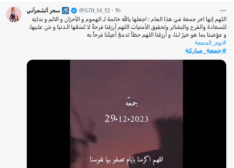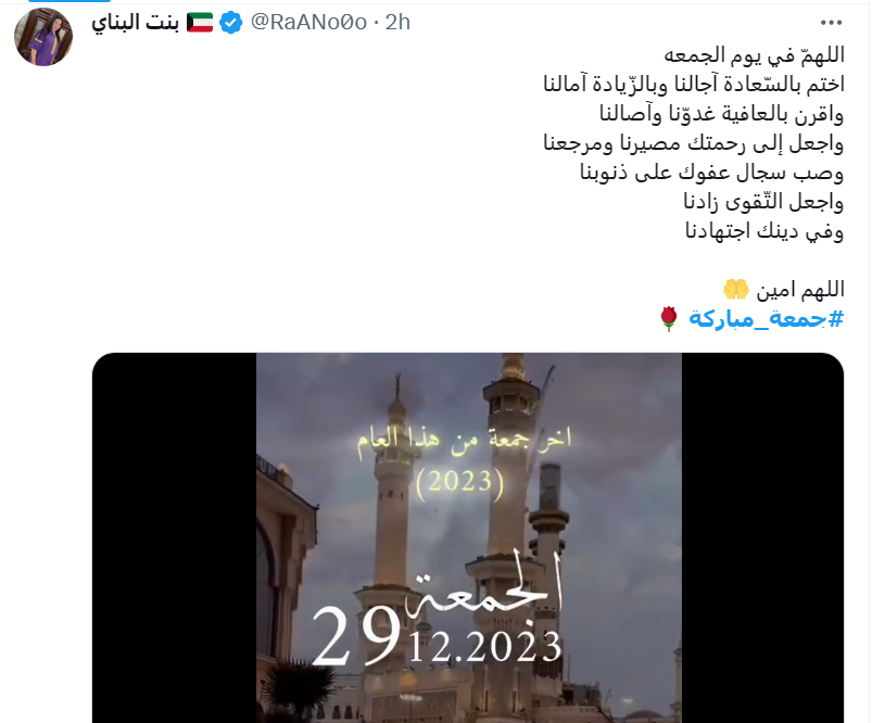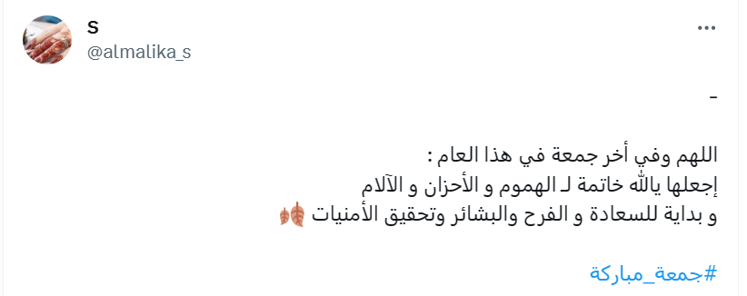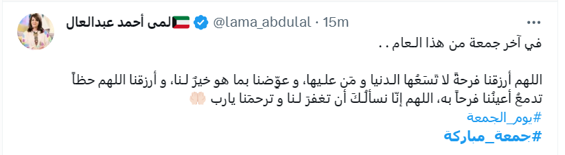 ونشر أحد المغردين: "اللهم إنها آخر جمعة في هذا العام: اجعلها يالله خاتمة للهموم والأحزان والألم وبداية للسعادة والفرح والبشائر وتحقيق الأمنيات اللهم أرزقنا فرحةً لا تَسَعُها الـدنيا ومَن علـيها، وعوِّضنا بما هو خيرٌ لـنا، وأرزقنا اللهم حظاً تدمعُ أعينُنا فرحاً به".