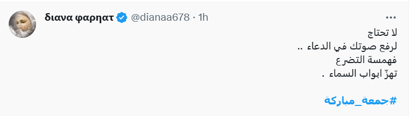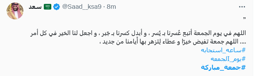 وغرد آخر: "في آخر جمعة من هذا الـعام.. اللهم أرزقنا فرحةً لا تَسَعُها الـدنيا ومَن علـيها، وعوِّضنا بما هو خيرٌ لـنا، وأرزقنا اللهم حظاً تدمعُ أعينُنا فرحاً به، اللهم إنّا نسألُـكَ أن تغفرَ لـنا و ترحمَنا يارب"، و"اللهمّ في يوم الجمعة اختم بالسّعادة آجالنا وبالزّيادة آمالنا واقرن بالعافية غدوّنا وآصالنا واجعل إلى رحمتك مصيرنا ومرجعنا وصب سجال عفوك على ذنوبنا واجعل التّقوى زادنا وفي دينك اجتهادنا".